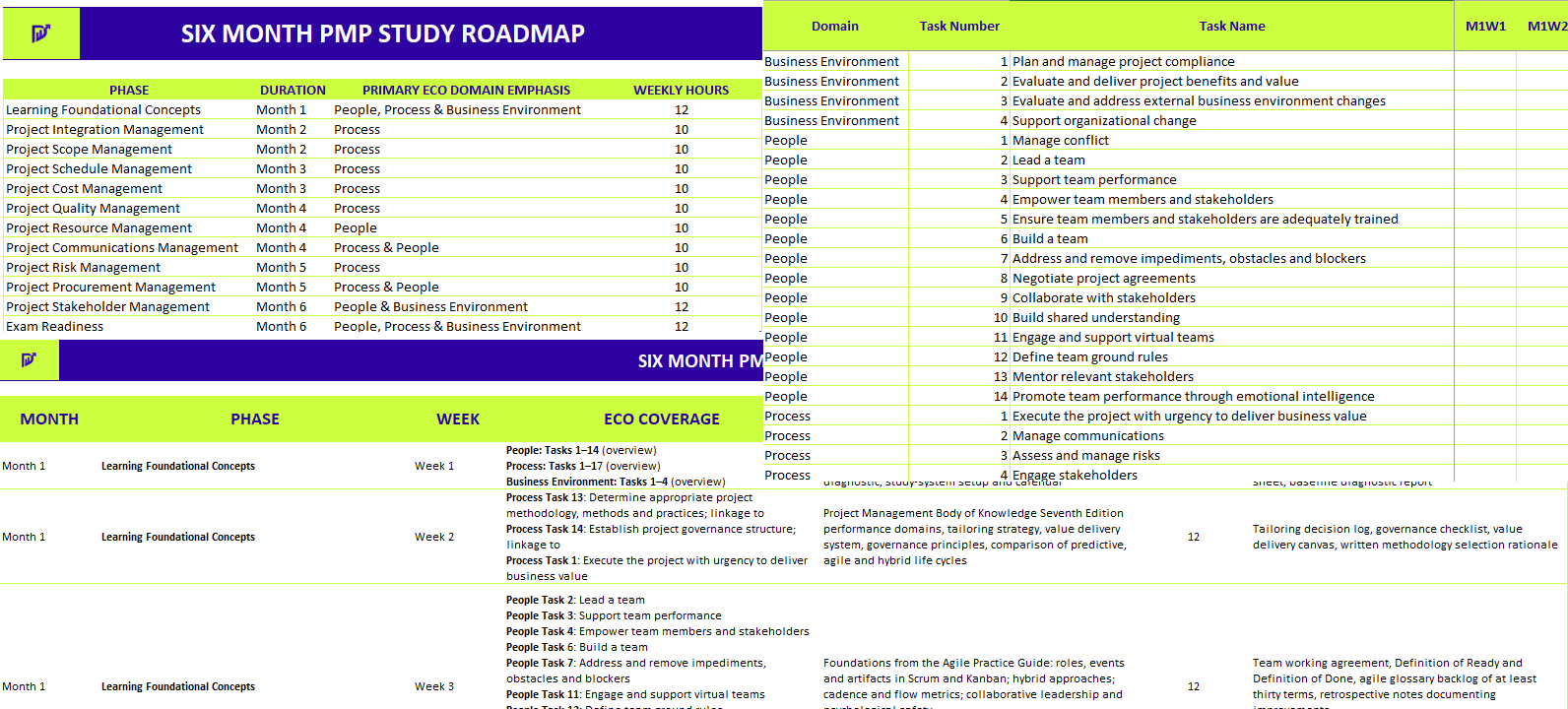 A six-month, PMI-aligned study system built for busy professionals. This toolkit turns the PMP® Examination Content Outline into a practical, week-by-week plan, complete with ITTO-style outputs, hours per week, and full ECO coverage, so you study with focus and finish exam-ready.